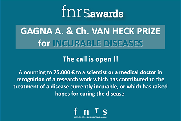 The "Fonds de la Recherche Scientifique – FNRS" will grant, in 2021, the triennial and international "GAGNA A. & Ch. VAN HECK PRIZE FOR INCURABLE DISEASES", amounting to 75.000 €, to a scientist or a medical doctor, in recognition of a research work which has contributed to the treatment of a disease currently incurable, or which has raised hopes for curing the disease.