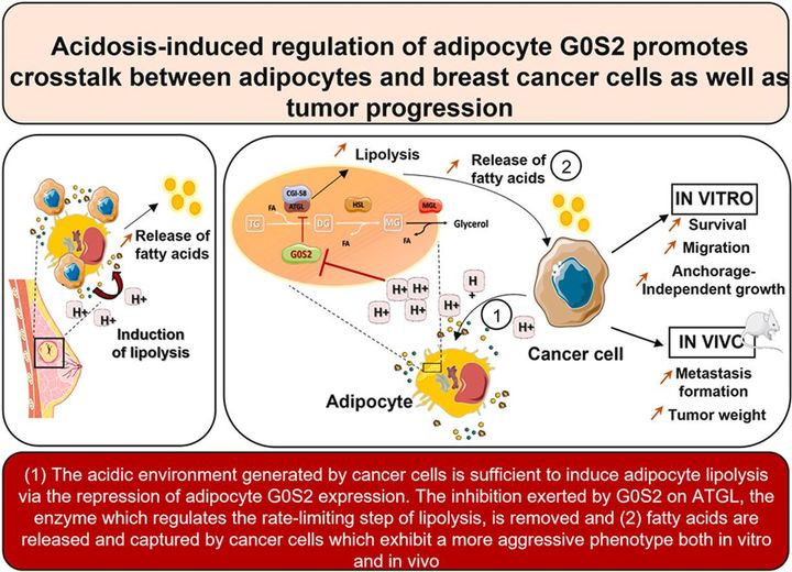 Acidosis-induced regulation of adipocyte G0S2 promotes crosstalk between adipocytes and breast cancer cells as well as tumor progression