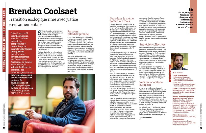 ➡ Grâce à son profil interdisciplinaire, Brendan Coolsaet possède les compétences et les outils qui lui permettront d’étudier les injustices liées à la crise environnementale et à la transition écologique en Europe.