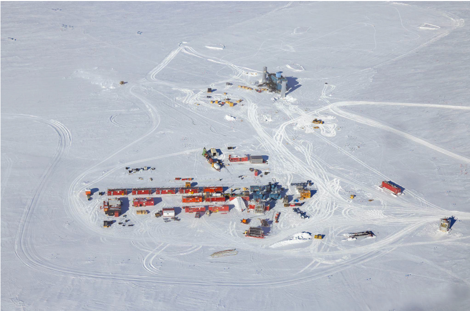 (c) Vue aérienne du camp de forage de l'IceCube Upgrade. Crédit : Michael Rayne/ASC-ARFF