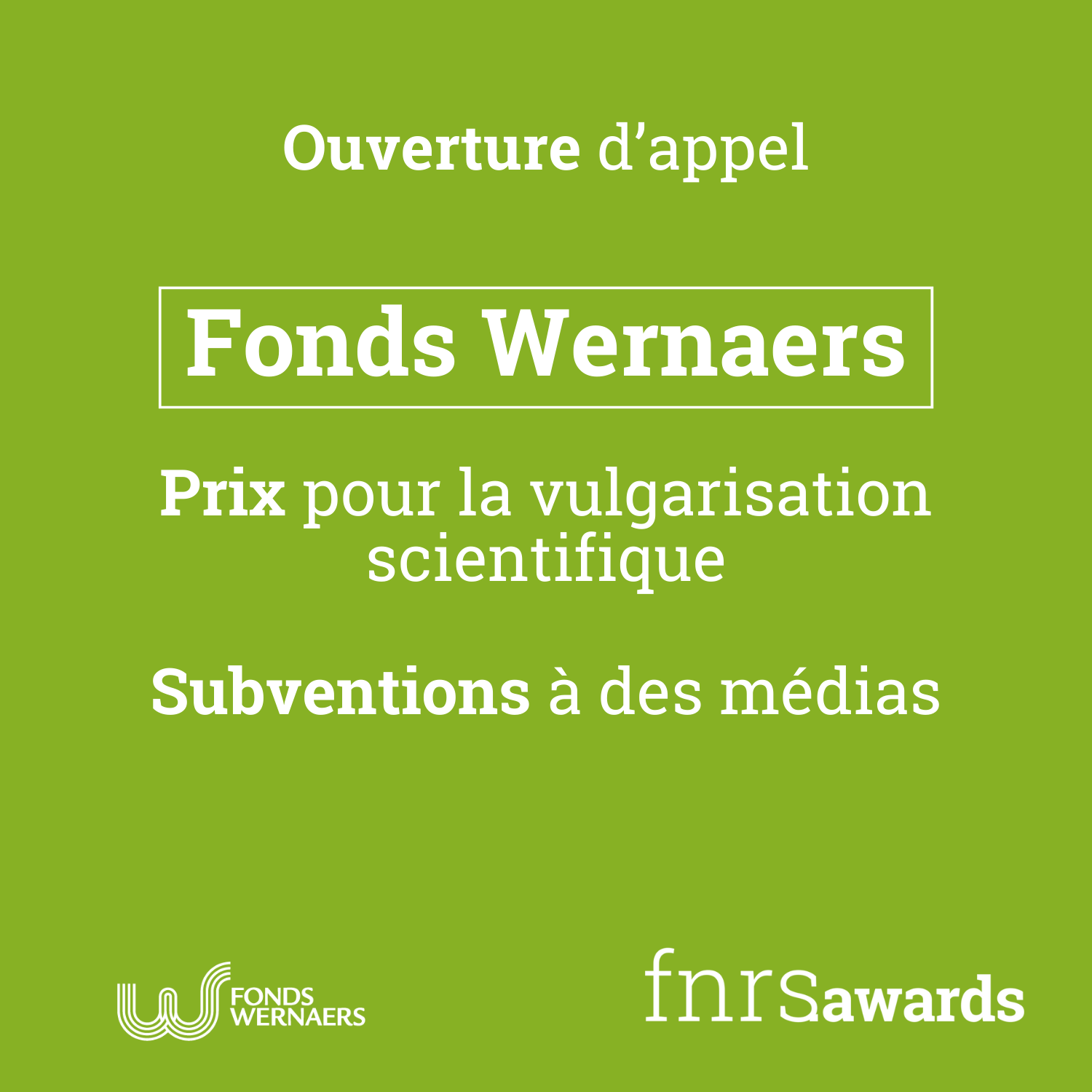 Le « Fonds Wernaers pour la recherche et la diffusion des connaissances » a pour objet de soutenir des actions de promotion de la recherche et de diffusion des connaissances scientifiques. Dans ce but, le Fonds octroiera en 2024 :