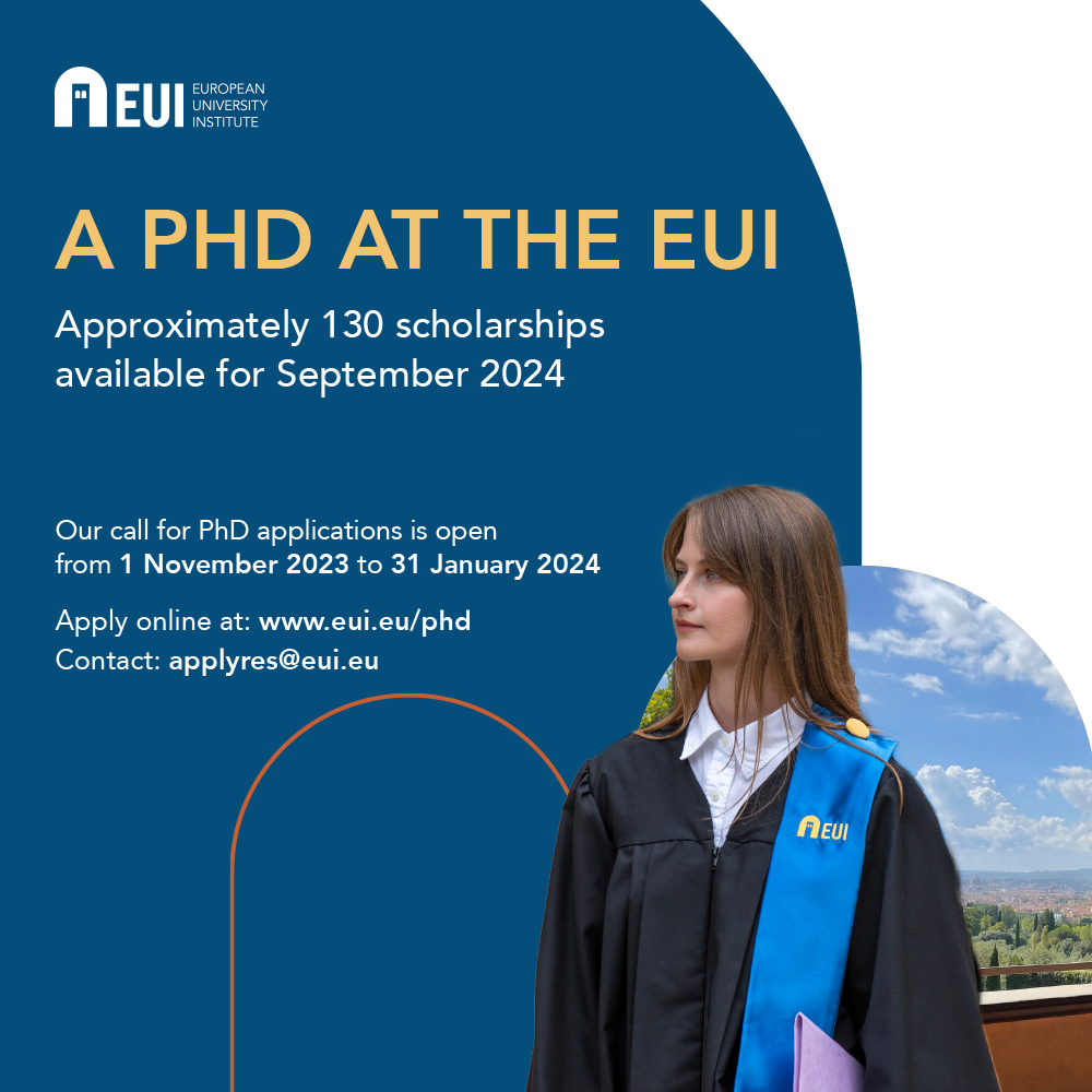 L’European University Institute a ouvert son appel annuel portant sur la période 2024-2025 pour des bourses de doctorat dans les quatre disciplines suivantes : Histoire et civilisation, Sciences économiques, Sciences juridiques et Sciences politiques et sociales. La soumission se fait directement sur le site de l’EUI jusqu’au 31 janvier 2024. Les candidats éligibles à une bourse financée par le F.R.S.-FNRS doivent respecter les règles d’éligibilité décrites dans le règlement « Bourse de doctorat de l'IUE - European University Institute (EUI)  ».